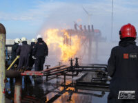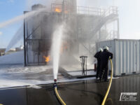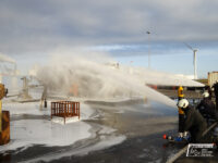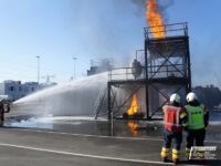 Die Kursteilnehmer absolvierten ein speziell auf die Bedürfnisse zuhause zugeschnittenes Einsatzleiter-Training. Nach einer kurzen Theorie-Einweisung ging es mit der Praxisausbildung gleich am ersten Tag los. Nach dem Testen des Vorgehens im Wasserschirm eines Hohlstrahlrohres, welches z.B. zur Abschirmung der Hitze bei einer Menschenrettung erforderlich ist, wurde als nächstes ein Brand in einer Prozessanlage simuliert. Für die wechselnden Einsatzleiter ging es hierbei darum, eine Lagefeststellung zu machen, Prioritäten zu setzen sowie gefährdete Objekte und Druckbehälter zu kühlen, um die Lage zu stabilisieren.