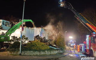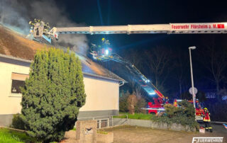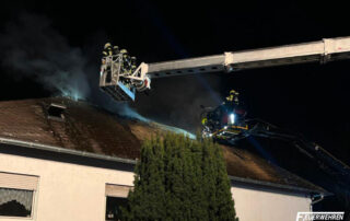 Kurz nach der Rückkehr vom vorherigen Einsatz, wurde die Feuerwehr Flörsheim mit dem Rüstwagen/Teleskopmast und einem Löschfahrzeug mit Atemschutzgeräteträgern zur überörtlichen Unterstützung nach Hattersheim-Eddersheim angefordert. Vor Ort war es in einem Mehrfamilienhaus zu einem Brand im Dachgeschoss gekommen. Über den Teleskopmast des Rüstwagen unterstützten die Flörsheimer Kräfte die Öffnungsmaßnahmen des Dachstuhls mittels einer speziellen Motorsäge unter Atemschutz. Im weiteren Einsatzverlauf wurde ein Umschlagbagger des Deponieparks aus Wicker zur finalen Dachöffnung durch zwei weitere Flörsheimer Fahrzeuge an die Einsatzstelle begleitet.